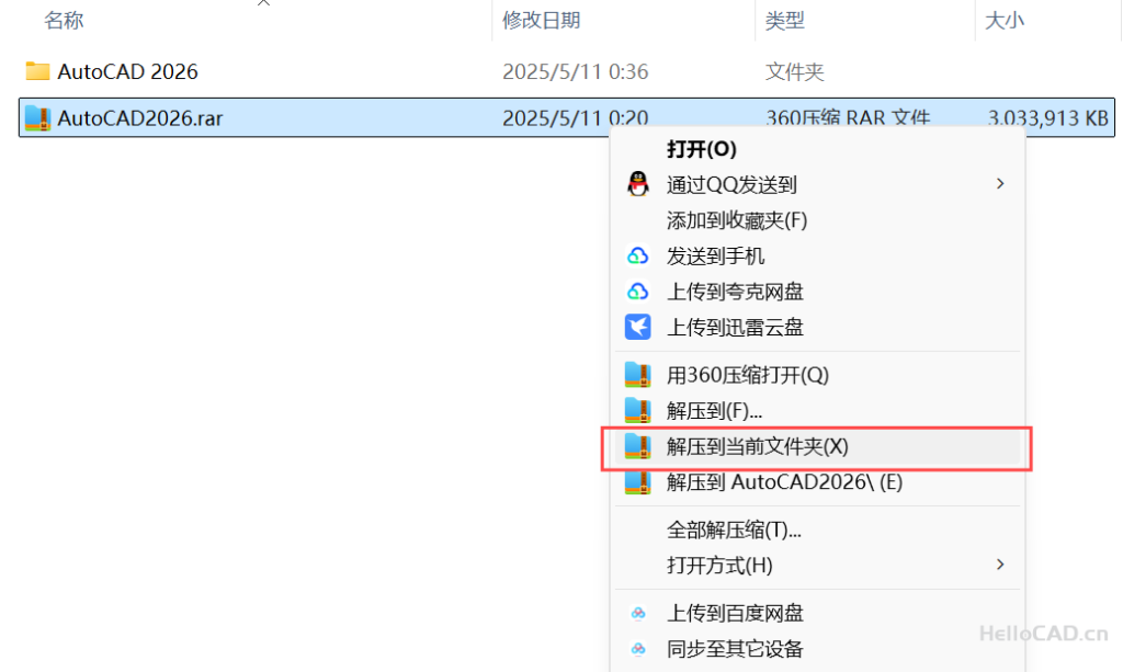 - 找到下载好的 AutoCAD 2026 安装包压缩文件,文件名通常为 “AutoCAD_2026_xxx.zip” 或 “AutoCAD_2026_xxx.rar” 。 如图 1 所示,右键单击压缩文件,在弹出的菜单中选择 “解压到当前文件夹”,也可以指定磁盘空间充足且路径简洁的解压位置,如 D:\CAD2026 。