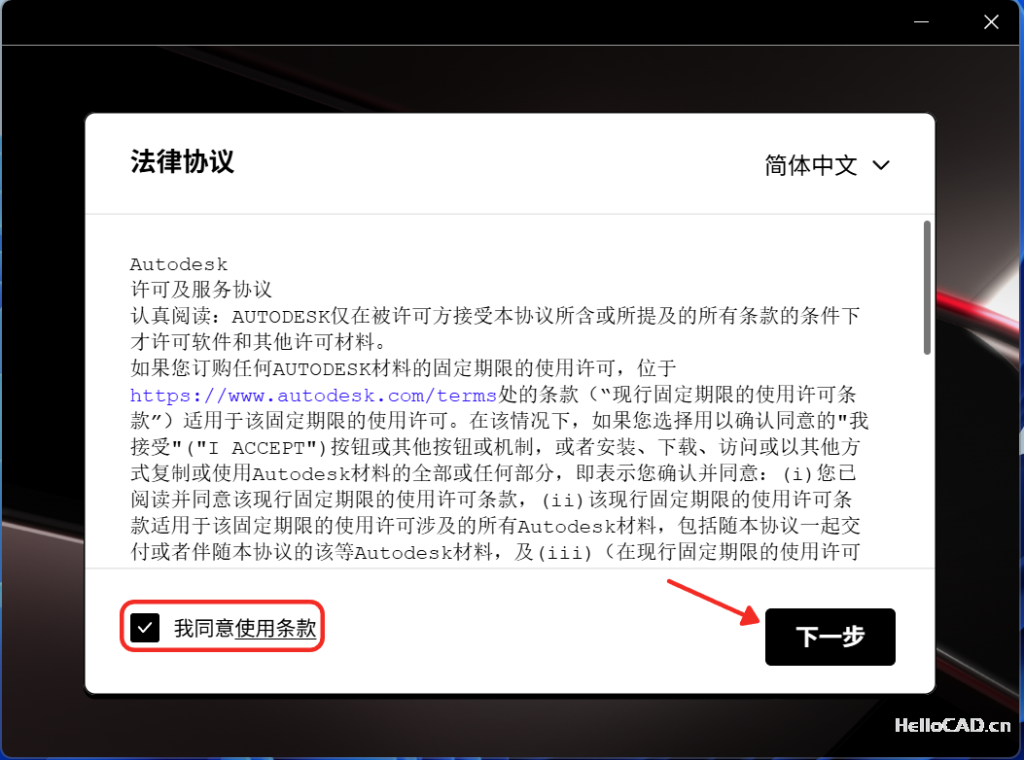 安装组件加载完成后,会弹出 “许可协议” 窗口,如图 3 所示。请仔细阅读许可协议内容,确认无误后,勾选 “我同意使用条款”,然后点击 “下一步” 。若不同意协议,将无法继续安装。