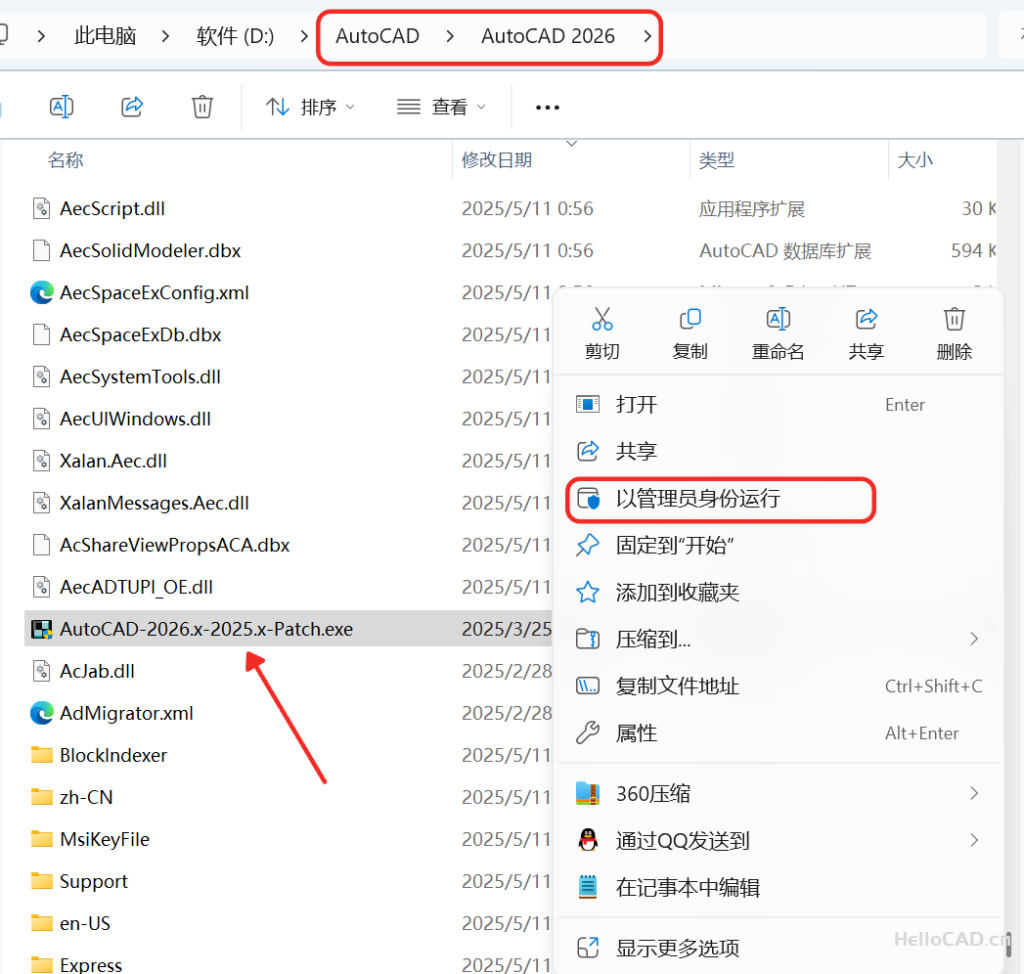 - 以管理员身份运行破解软件:在安装目录中找到刚刚复制进来的破解软件文件,如图 9 所示,右键单击该文件,选择 “以管理员身份运行” 。