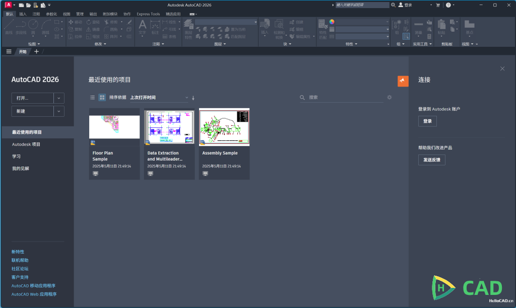 - 进入软件主界面:软件初始化完成后,即可进入 AutoCAD 2026 的主界面,如图 13 所示,在这里可以看到 “最近使用的项目” 等板块 。